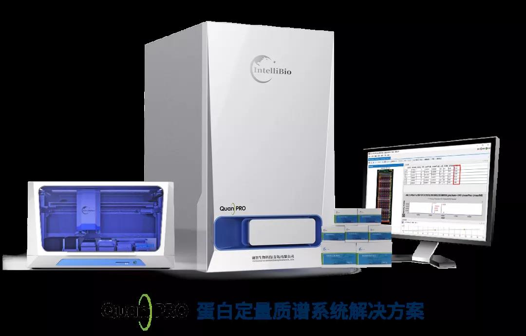 QuanPRO蛋白定量质谱系统的技术原理:用一定强度的激光照射样本与基质形成的共结晶薄膜,基质从激光中吸收能量而汽化,并迅速降解,使样本分解吸附,基质和样本之间发生电荷转移从而使样本分子发生电离;带有电荷的样本分子在电场作用下加速飞过飞行管道,因为离子的质荷比与离子的飞行时间呈正比,所以不同质量的离子因达到检测器的飞行时间不同而被检测,以离子峰为纵坐标、离子质荷比为横坐标形成特征性的质量图谱,进行实现对不同质荷比的物质进行区分和鉴定。