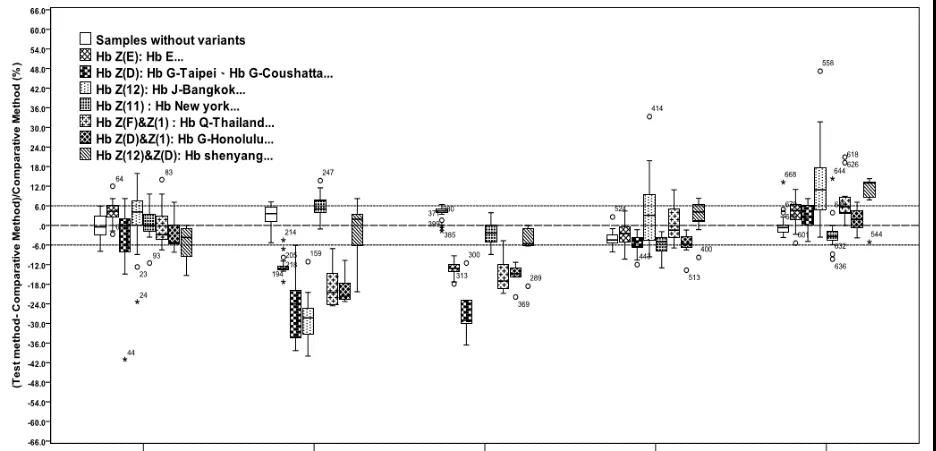 注:不同检测系统受变异血红蛋白影响差异巨大,从左至右的平台分别为:伯乐HPLC、东曹HPLC、爱科来HPLC、罗氏免疫比浊法、普莱默斯亲和层析HPLC