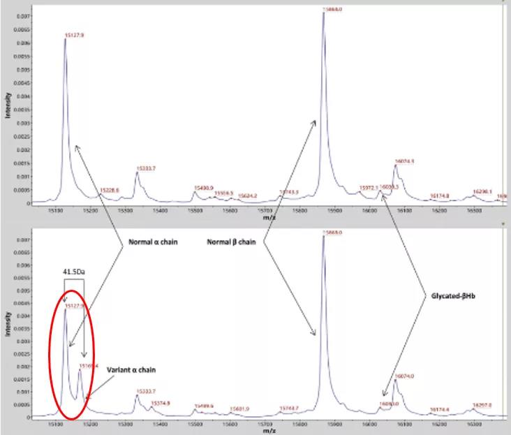 参考文献:AnpingXu, Yajun Wang, et al. Detection of a novel hemoglobin variant HbLiaoning by matrix assisted laser desorption/ionization-time offlight mass spectrometry. Clin. Chem. Lab. Med. 2019,57(12):e328-e330.