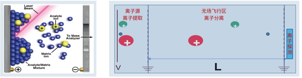 附,基质和样本之间发生电荷转移从而使样本分子发生电离;带有电荷的样本分子在电场作用下加速飞过飞行管道,因为离子的质荷比与离子的飞行时间呈正比,所以不同质量的离子因达到检测器的飞行时间不同而被检测,以离子峰为纵坐标、离子质荷比为横坐标形成特征性的质量图谱,进行实现对不同质荷比的物质进行区分和鉴定。