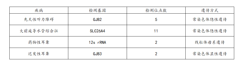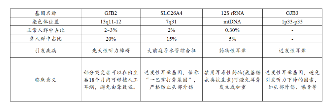 中国人群中最常见的遗传性耳聋基因是GJB2、SLC26A4、rRNA和GJB34,其引起的疾病及检测意义如下表: