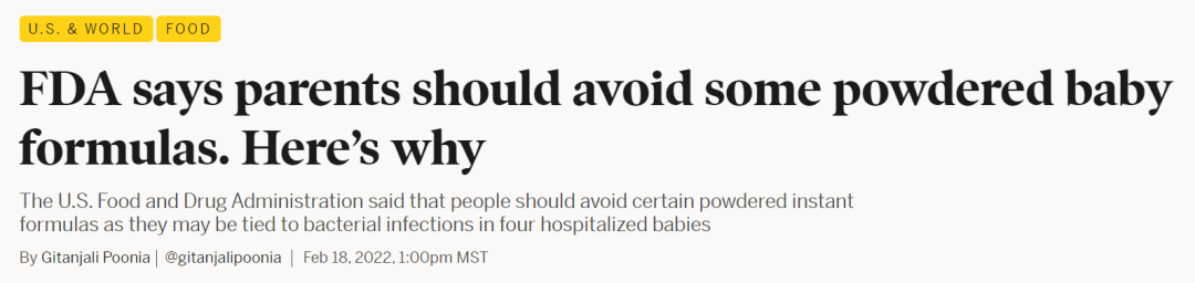 公告显示,2月18日,美国食品和药品监督管理局(FDA)宣布,正在调查四名婴儿感染克罗诺杆菌和沙门氏菌事件的投诉。“所有与这些投诉有关的四例病例都住院治疗了,其中一例可能因克罗诺杆菌导致了死亡。”四名婴儿均食用了美国某公司在密歇根州斯特吉斯工厂生产的奶粉。