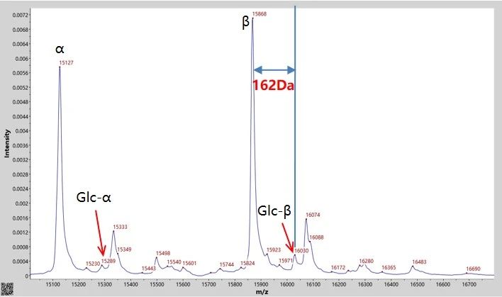 与其他HbA1c检测系统不同,MALDI-TOF MS检测的是游离的珠蛋白链,而不是四聚体。其检测原理是体内非酶促糖化反应造成β珠蛋白链增加一个葡萄糖,使得糖化与非糖化β珠蛋白链分子量相差162Da,通过糖化β珠蛋白链/(β珠蛋白链+糖化β珠蛋白链)来计算其糖基化率。
