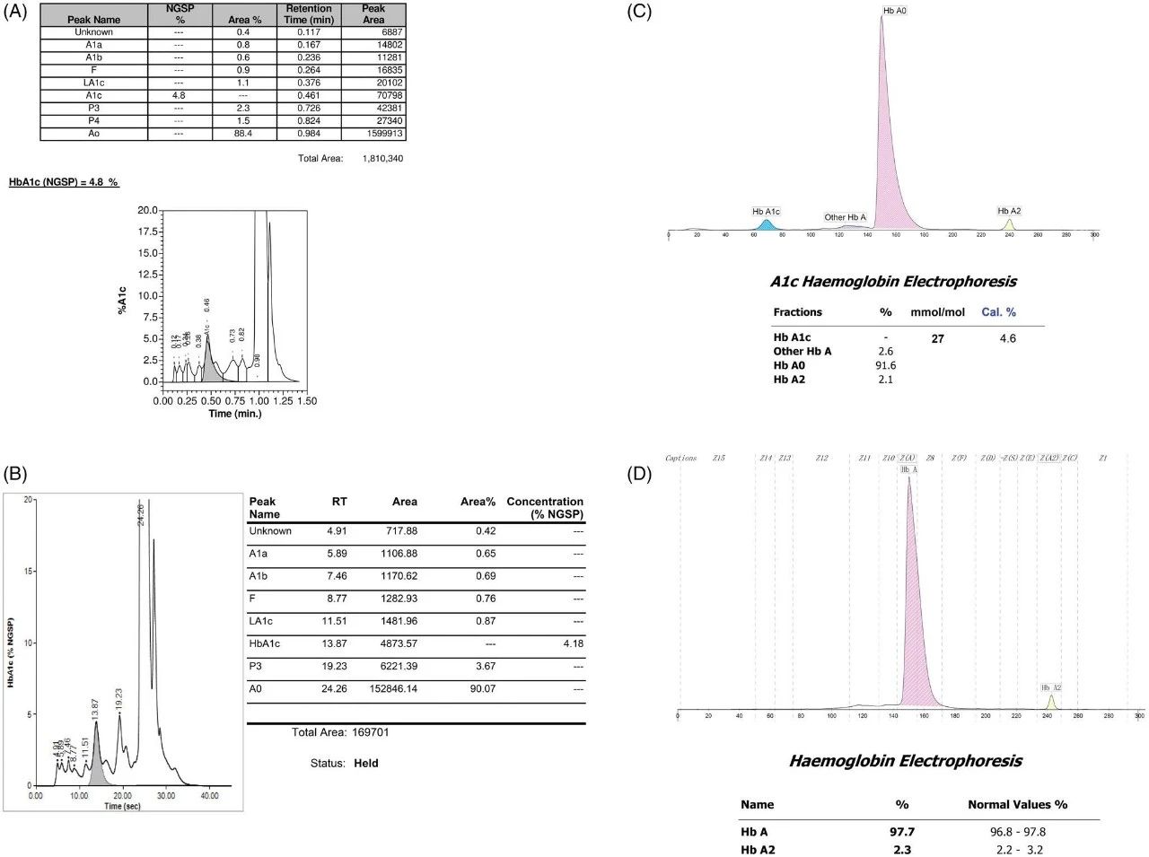 图.糖化血红蛋白和血红蛋白分析。通过Variant II Turbo 2.0(A),HPLC系统(B),和CE系统(HbA1c程序)(C)检测糖化血红蛋白。血红蛋白分析是通过CE系统的Hb程序(D)。