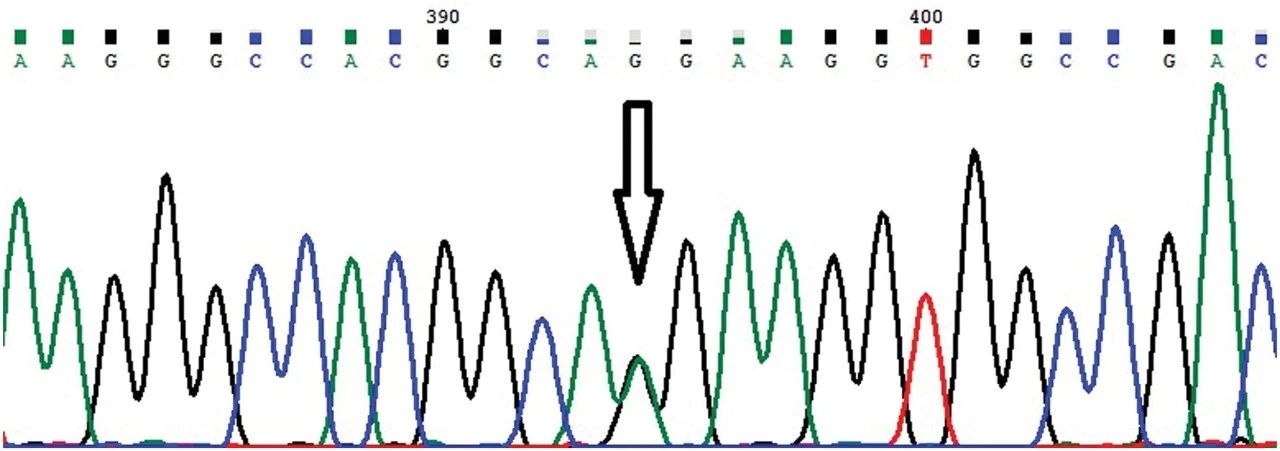图.Hb-柳州Sanger序列测定结果。箭头表示杂合突变[HBA1:C.182A→G] 在HBA1基因中。