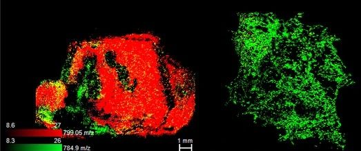 在m/z=784.9时,发现在癌变组织中有高表达(右),在癌旁组织中,随着离癌变组织距离越远,其表达快速下降(左)。