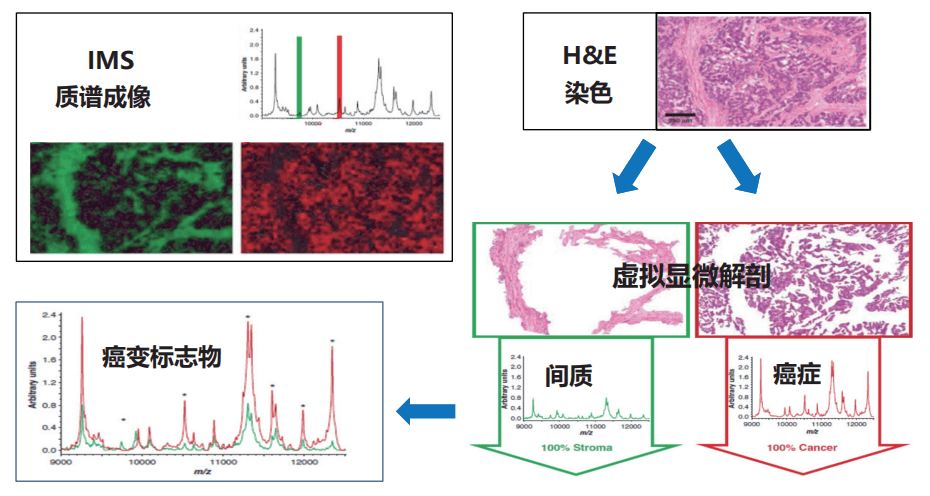 通过HE染色技术可以看到癌变组织与间质差异,而通过癌变与间质质谱成像图谱比较证实了差异峰存在。